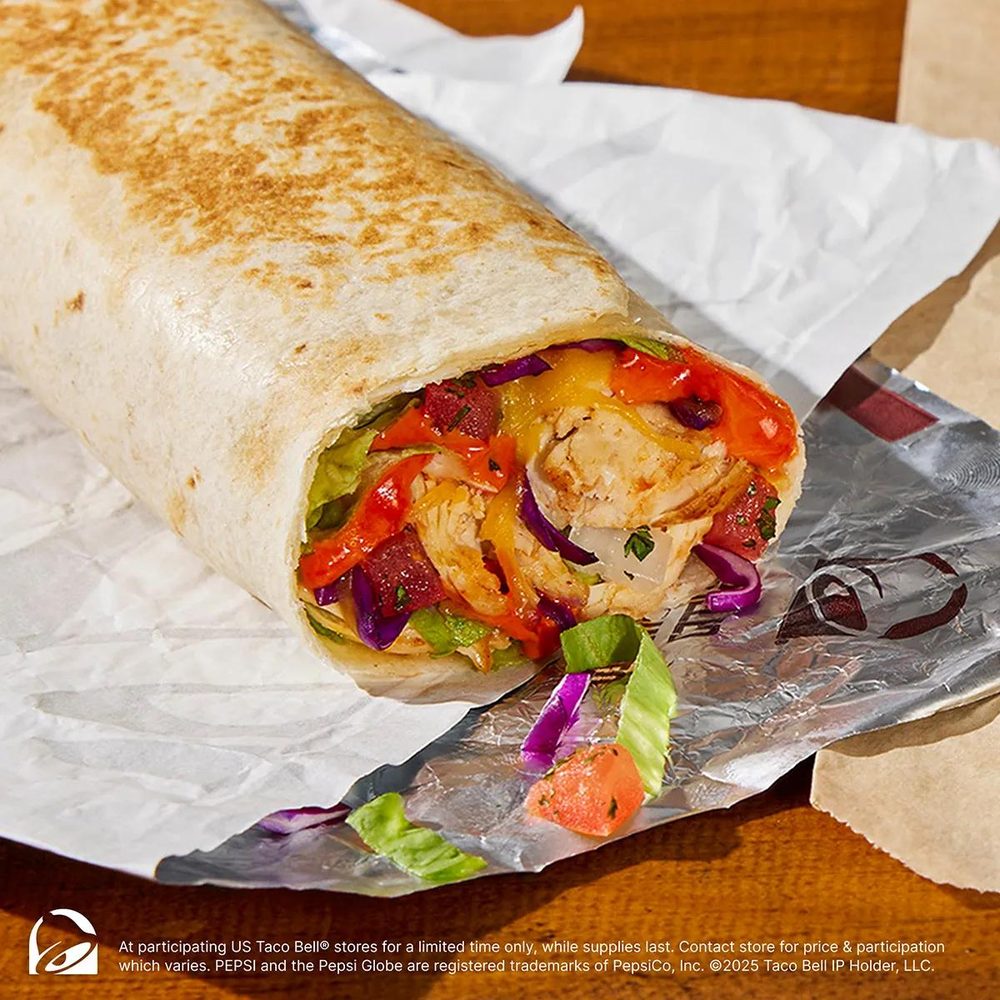 A warm flour tortilla filled with grilled, marinated all-white-meat chicken, seasoned rice, Red Sauce, a blend of mozzarella, pepperjack, and cheddar cheeses, and reduced-fat sour cream.